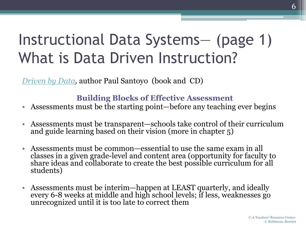 C-A Teachers' Resource Center--J. Robinson, director Instructional Data Systems— (page 1)What is Data Driven Instruction? Driven by Data, author Paul Santoyo (book and CD) Building Blocks of Effective Assessment • Assessments must be the starting point—before any teaching ever begins • Assessments must be transparent—schools take control of their curriculum and guide learning based on their vision (more in chapter 5) • Assessments must be common—essential to use the same exam in all classes in a given grade-level and content area (opportunity for faculty to share ideas and collaborate to create the best possible curriculum for all students) • Assessments must be interim—happen at LEAST quarterly, and ideally every 6-8 weeks at middle and high school levels; if less, weaknesses go unrecognized until it is too late to correct them