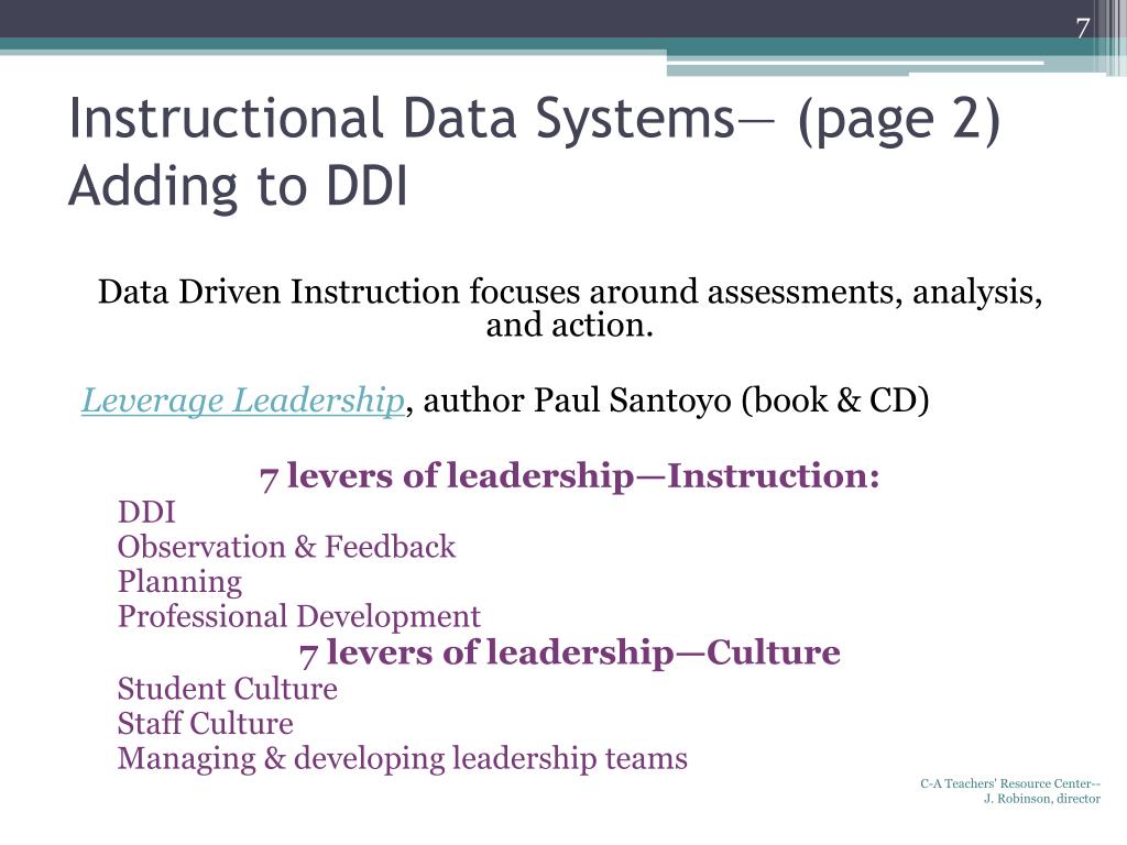 C-A Teachers' Resource Center--J. Robinson, director Instructional Data Systems— (page 2)Adding to DDI Data Driven Instruction focuses around assessments, analysis, and action. Leverage Leadership, author Paul Santoyo (book & CD) 7 levers of leadership—Instruction: DDI Observation & Feedback Planning Professional Development 7 levers of leadership—Culture Student Culture Staff Culture Managing & developing leadership teams