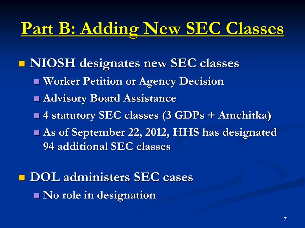 Part B: Adding New SEC Classes • NIOSH designates new SEC classes • Worker Petition or Agency Decision • Advisory Board Assistance • 4 statutory SEC classes (3 GDPs + Amchitka) • As of September 22, 2012, HHS has designated 94 additional SEC classes • DOL administers SEC cases • No role in designation