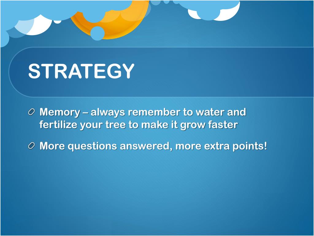 STRATEGY • Memory – always remember to water and fertilize your tree to make it grow faster • More questions answered, more extra points!