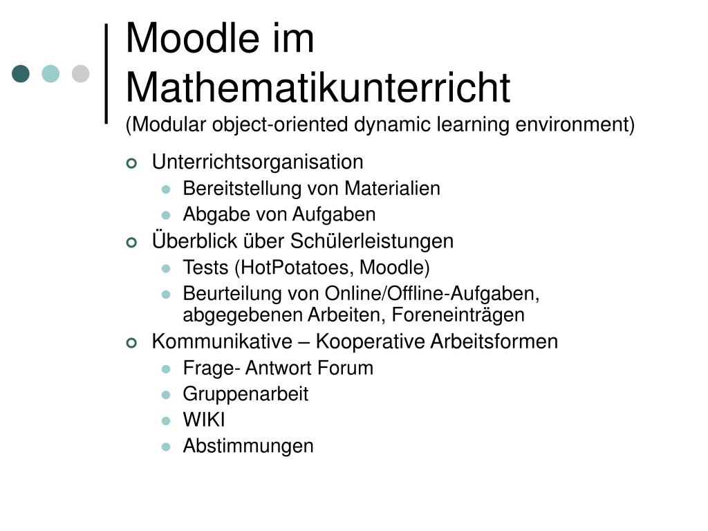 Moodle im Mathematikunterricht(Modular object-oriented dynamic learning environment) • Unterrichtsorganisation • Bereitstellung von Materialien • Abgabe von Aufgaben • Überblick über Schülerleistungen • Tests (HotPotatoes, Moodle) • Beurteilung von Online/Offline-Aufgaben, abgegebenen Arbeiten, Foreneinträgen • Kommunikative – Kooperative Arbeitsformen • Frage- Antwort Forum • Gruppenarbeit • WIKI • Abstimmungen