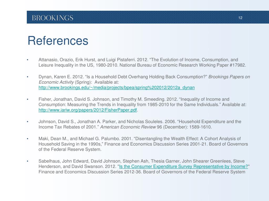 References • Attanasio, Orazio, Erik Hurst, and Luigi Pistaferri. 2012. “The Evolution of Income, Consumption, and Leisure Inequality in the US, 1980-2010. National Bureau of Economic Research Working Paper #17982. • Dynan, Karen E. 2012. “Is a Household Debt Overhang Holding Back Consumption?” Brookings Papers on Economic Activity (Spring): Available at: http://www.brookings.edu/~/media/projects/bpea/spring%202012/2012a_dynan • Fisher, Jonathan, David S. Johnson, and Timothy M. Smeeding. 2012. “Inequality of Income and Consumption: Measuring the Trends in Inequality from 1985-2010 for the Same Individuals.” Available at: http://www.iariw.org/papers/2012/FisherPaper.pdf. • Johnson, David S., Jonathan A. Parker, and Nicholas Souleles. 2006. “Household Expenditure and the Income Tax Rebates of 2001.” American Economic Review 96 (December): 1589-1610. • Maki, Dean M., and Michael G. Palumbo. 2001. “Disentangling the Wealth Effect: A Cohort Analysis of Household Saving in the 1990s,” Finance and Economics Discussion Series 2001-21. Board of Governors of the Federal Reserve System. • Sabelhaus, John Edward, David Johnson, Stephen Ash, Thesia Garner, John Shearer Greenlees, Steve Henderson, and David Swanson. 2012. "Is the Consumer Expenditure Survey Representative by Income?" Finance and Economics Discussion Series 2012-36. Board of Governors of the Federal Reserve System