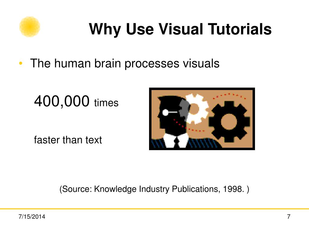 Why Use Visual Tutorials • Use of visuals can improve learning by up to 400 % (Source: Knowledge Industry Publications, 1998. )