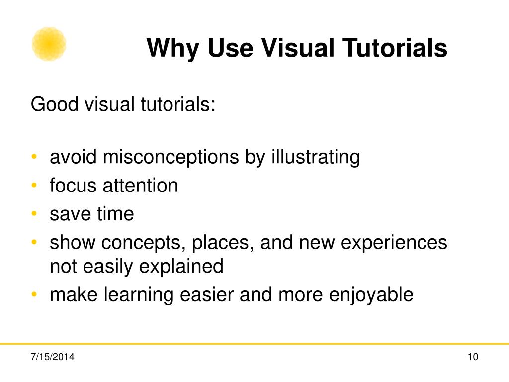 Why Use Visual Tutorials Good visual tutorials: • avoid misconceptions by illustrating • focus attention • save time • show concepts, places, and new experiences not easily explained • make learning easier and more enjoyable