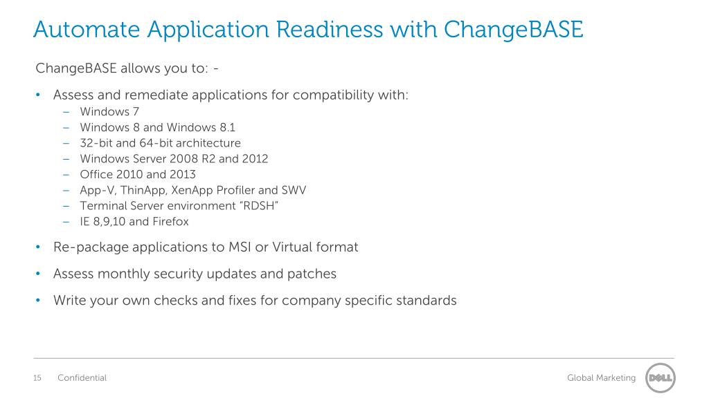 Automate Application Readiness with ChangeBASE ChangeBASE allows you to: - • Assess and remediate applications for compatibility with: • Windows 7 • Windows 8 and Windows 8.1 • 32-bit and 64-bit architecture • Windows Server 2008 R2 and 2012 • Office 2010 and 2013 • App-V, ThinApp, XenApp Profiler and SWV • Terminal Server environment “RDSH” • IE 8,9,10 and Firefox • Re-package applications to MSI or Virtual format • Assess monthly security updates and patches • Write your own checks and fixes for company specific standards
