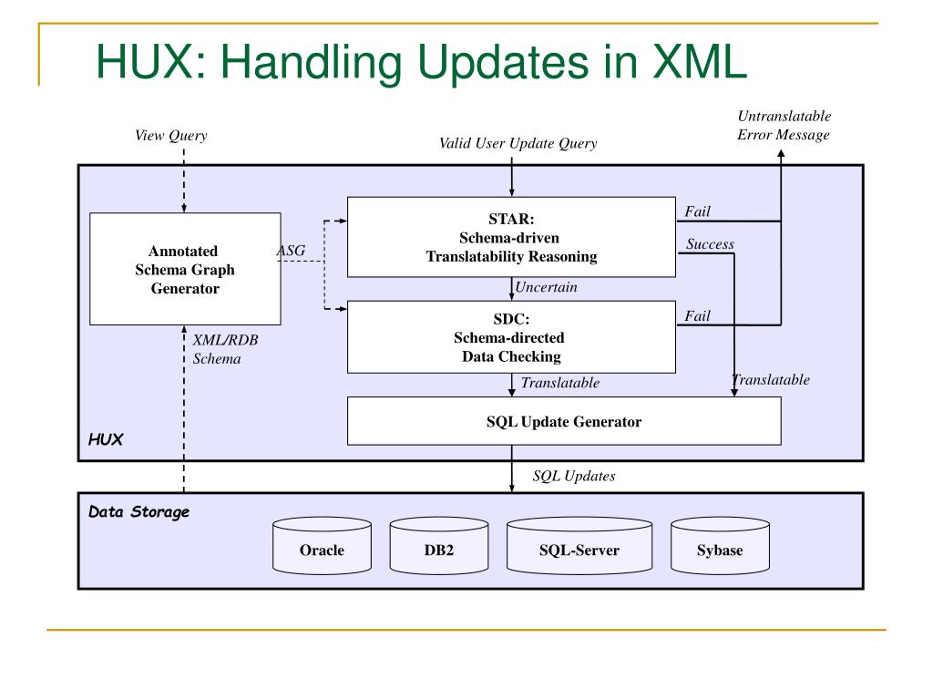 UntranslatableError Message View Query Valid User Update Query Fail STAR: Schema-driven Translatability Reasoning Annotated Schema Graph Generator Success ASG Uncertain SDC: Schema-directed Data Checking Fail XML/RDB Schema Translatable Translatable SQL Update Generator HUX SQL Updates Data Storage Oracle DB2 SQL-Server Sybase HUX: Handling Updates in XML