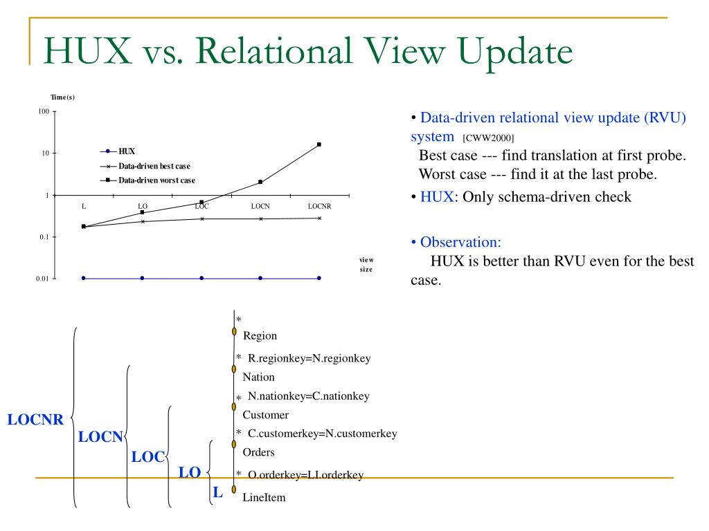 LOCNR LOCN LOC LO View L * Region * R.regionkey=N.regionkey Nation N.nationkey=C.nationkey * Customer * C.customerkey=N.customerkey Orders * O.orderkey=LI.orderkey LineItem HUX vs. Relational View Update System • Data-driven relational view update (RVU) system [CWW2000] Best case --- find translation at first probe. Worst case --- find it at the last probe. • HUX: Only schema-driven check • Observation: HUX is better than RVU even for the best case.