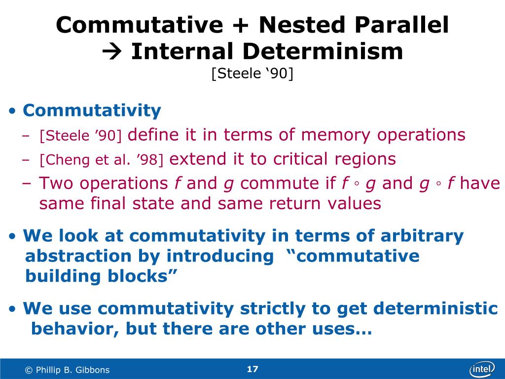 Commutative + Nested Parallel Internal Determinism[Steele ‘90] • Commutativity • [Steele ’90] define it in terms of memory operations • [Cheng et al. ’98] extend it to critical regions • Two operations f and g commute if f ◦ g and g ◦ f have same final state and same return values • We look at commutativity in terms of arbitrary abstraction by introducing “commutative building blocks” • We use commutativity strictly to get deterministic behavior, but there are other uses…