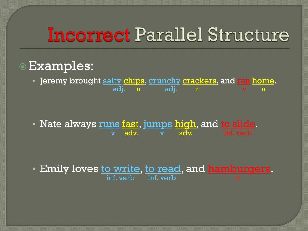 Incorrect Parallel Structure • Examples: • Jeremy brought saltychips, crunchycrackers, and ranhome. adj.nadj.nvn • Nate always runsfast, jumpshigh, and to slide. vadv.vadv.inf. verb • Emily loves to write, to read, and hamburgers. inf. verbinf. verbn