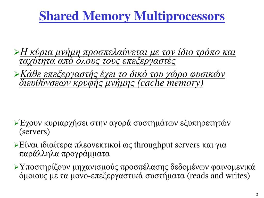 Shared Memory Multiprocessors • Η κύρια μνήμη προσπελαύνεται με τον ίδιο τρόπο και ταχύτητα από όλους τους επεξεργαστές • Κάθε επεξεργαστής έχει το δικό του χώρο φυσικών διευθύνσεων κρυφής μνήμης (cache memory) • Έχουν κυριαρχήσει στην αγορά συστημάτων εξυπηρετητών (servers) • Είναι ιδιαίτερα πλεονεκτικοί ως throughput servers και για παράλληλα προγράμματα • Υποστηρίζουν μηχανισμούς προσπέλασης δεδομένων φαινομενικά όμοιους με τα μονο-επεξεργαστικά συστήματα (reads and writes)
