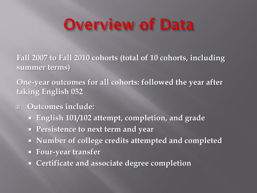 Overview of Data • Fall 2007 to Fall 2010 cohorts (total of 10 cohorts, including summer terms) • One-year outcomes for all cohorts: followed the year after taking English 052 • Outcomes include: • English 101/102 attempt, completion, and grade • Persistence to next term and year • Number of college credits attempted and completed • Four-year transfer • Certificate and associate degree completion