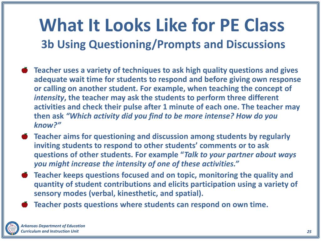 What It Looks Like for PE Class3b Using Questioning/Prompts and Discussions Teacher uses a variety of techniques to ask high quality questions and gives adequate wait time for students to respond and before giving own response or calling on another student. For example, when teaching the concept of intensity, the teacher may ask the students to perform three different activities and check their pulse after 1 minute of each one. The teacher may then ask “Which activity did you find to be more intense? How do you know?” Teacher aims for questioning and discussion among students by regularly inviting students to respond to other students’ comments or to ask questions of other students. For example “Talk to your partner about ways you might increase the intensity of one of these activities.” Teacher keeps questions focused and on topic, monitoring the quality and quantity of student contributions and elicits participation using a variety of sensory modes (verbal, kinesthetic, and spatial). Teacher posts questions where students can respond on own time.