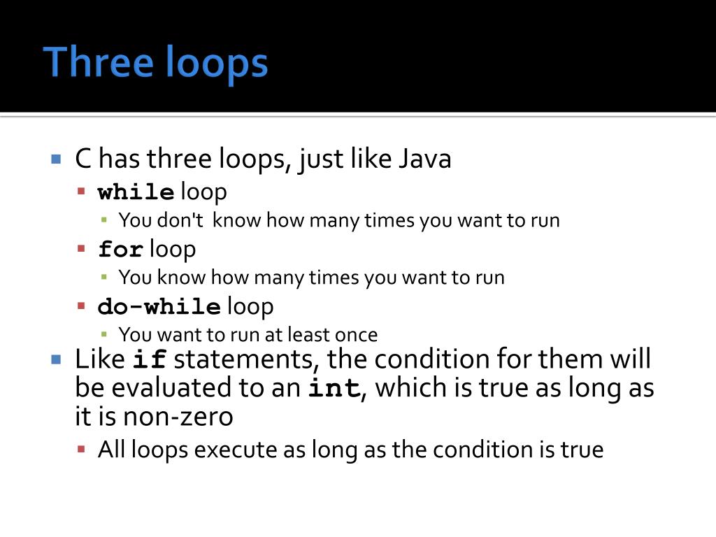 Three loops • C has three loops, just like Java • while loop • You don't know how many times you want to run • for loop • You know how many times you want to run • do-while loop • You want to run at least once • Like if statements, the condition for them will be evaluated to an int, which is true as long as it is non-zero • All loops execute as long as the condition is true