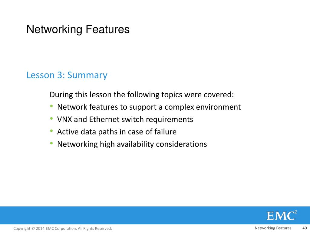 Networking Features Lesson 3: Summary During this lesson the following topics were covered: Network features to support a complex environment VNX and Ethernet switch requirements Active data paths in case of failure Networking high availability considerations Networking Features