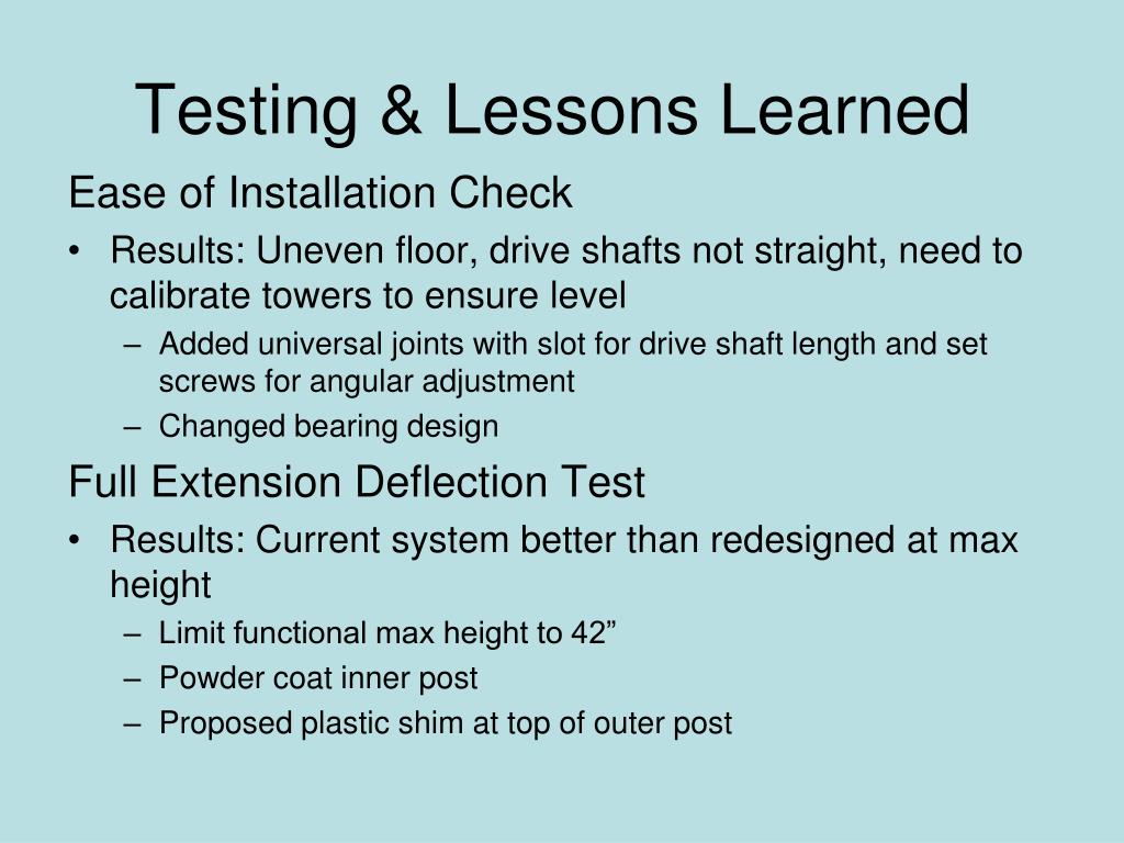 Testing & Lessons Learned Ease of Installation Check • Results: Uneven floor, drive shafts not straight, need to calibrate towers to ensure level • Added universal joints with slot for drive shaft length and set screws for angular adjustment • Changed bearing design Full Extension Deflection Test • Results: Current system better than redesigned at max height • Limit functional max height to 42” • Powder coat inner post • Proposed plastic shim at top of outer post