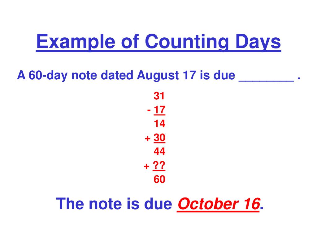 Example of Counting Days A 60-day note dated August 17 is due ________ . 31 - 17 14 + 30 44 + ?? 60 The note is due October 16.