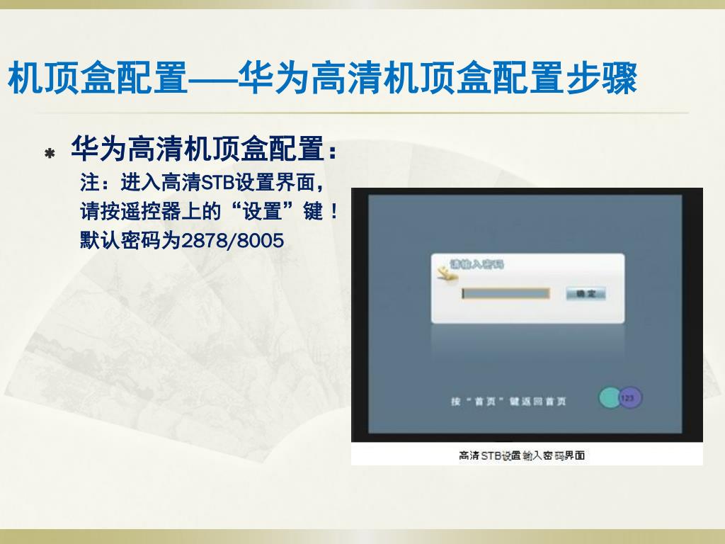 机顶盒配置——华为高清机顶盒配置步骤 • 华为高清机顶盒配置: 注:进入高清STB设置界面, 请按遥控器上的“设置”键 ! 默认密码为2878/8005