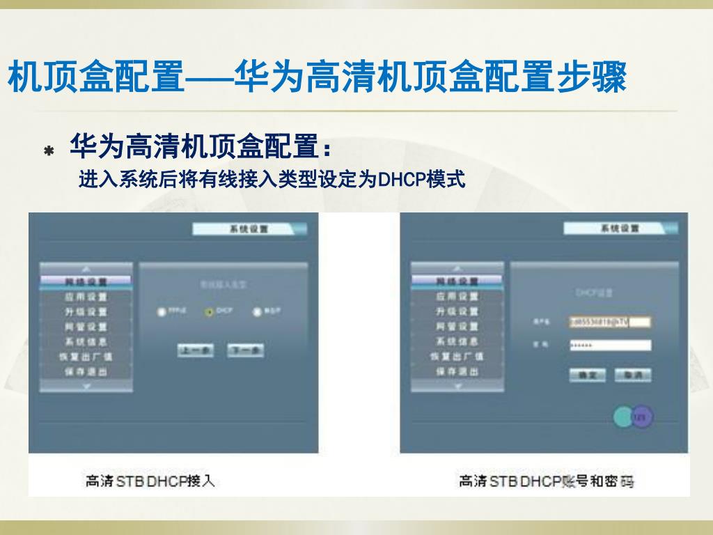 机顶盒配置——华为高清机顶盒配置步骤 • 华为高清机顶盒配置: 进入系统后将有线接入类型设定为DHCP模式
