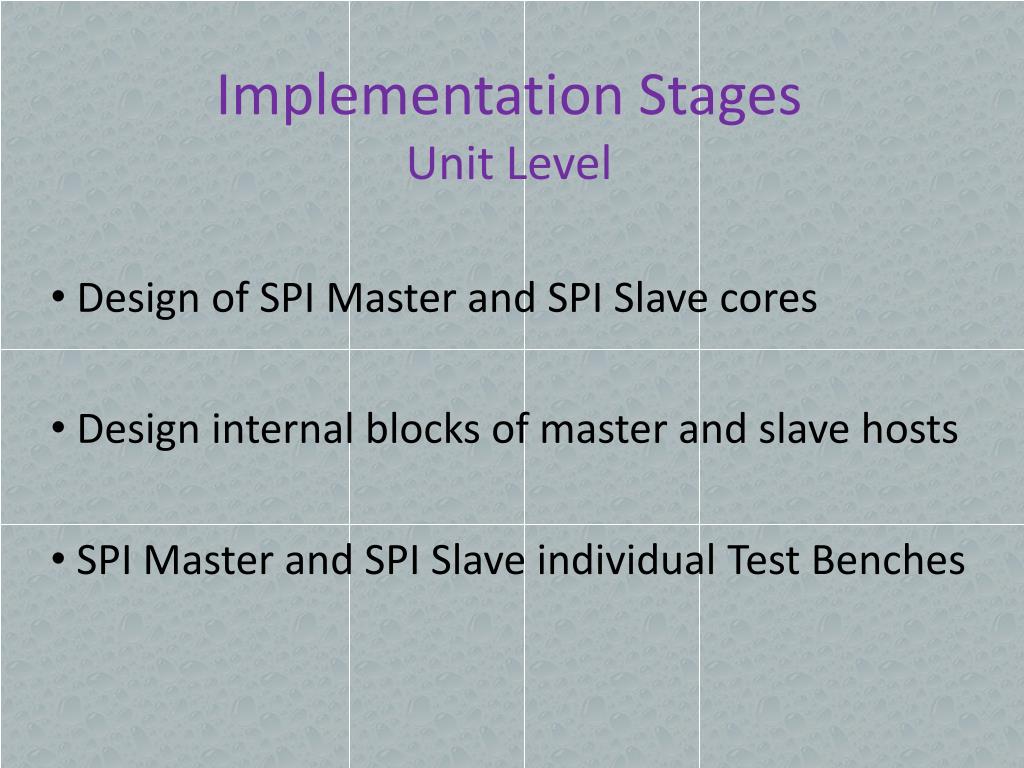 Implementation StagesUnit Level Design of SPI Master and SPI Slave cores Design internal blocks of master and slave hosts SPI Master and SPI Slave individual Test Benches