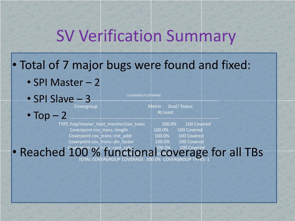 COVERGROUP COVERAGE:----------------------------------------------------------------------------------------------------Covergroup Metric Goal/ Status At Least ---------------------------------------------------------------------------------------------------- TYPE /top/master_host_monitor/cov_trans 100.0% 100 Covered Coverpointcov_trans::length 100.0% 100 Covered Coverpointcov_trans::init_addr 100.0% 100 Covered Coverpointcov_trans::div_factor 100.0% 100 Covered Coverpointcov_trans::cpol_cpha 100.0% 100 Covered CLASS master_host_monitorTOTAL COVERGROUP COVERAGE: 100.0% COVERGROUP TYPES: 1 SV Verification Summary Total of 7 major bugs were found and fixed: SPI Master – 2 SPI Slave – 3 Top – 2 Reached 100 % functional coverage for all TBs