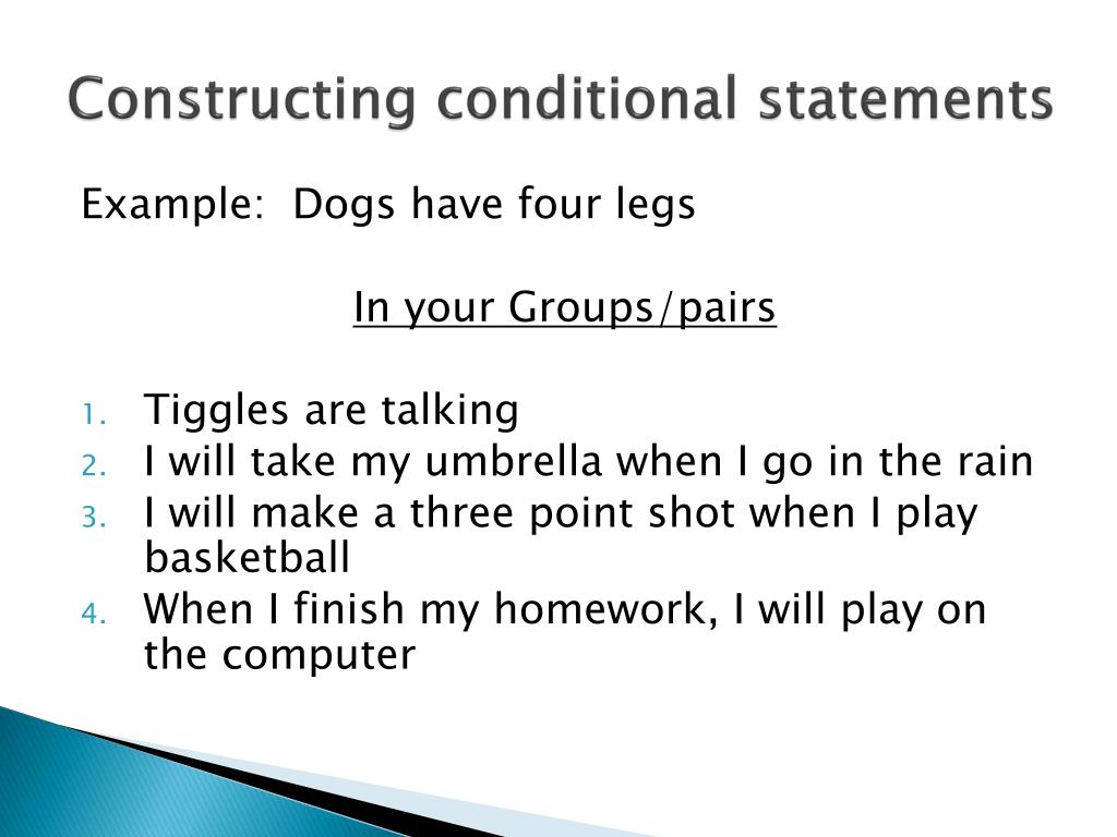 Constructing conditional statements Example: Dogs have four legs In your Groups/pairs • Tiggles are talking • I will take my umbrella when I go in the rain • I will make a three point shot when I play basketball • When I finish my homework, I will play on the computer
