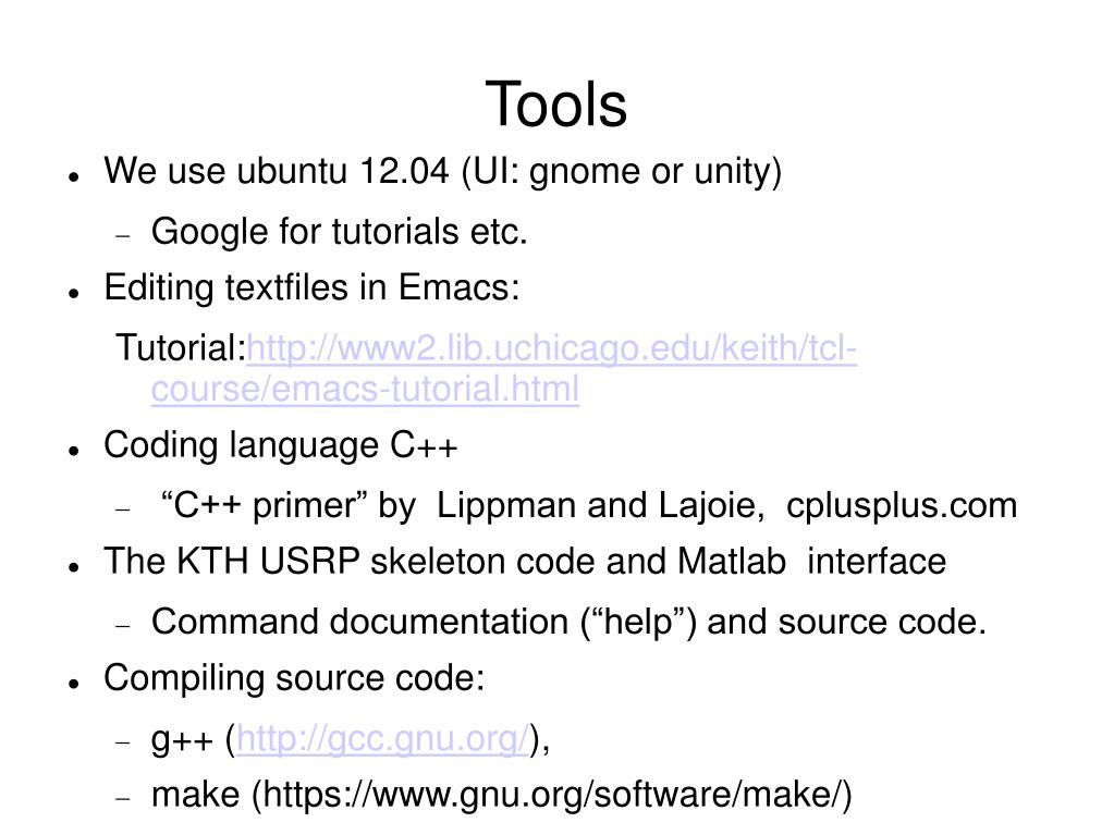 Per Zetterberg. USRP Lecture. Tools. We use ubuntu 12.04 (UI: gnome or unity) Google for tutorials etc. Editing textfiles in Emacs: Tutorial: http://www2.lib.uchicago.edu/keith/tcl-course/emacs-tutorial.html Coding language C++ “C++ primer” by Lippman and Lajoie, cplusplus.com