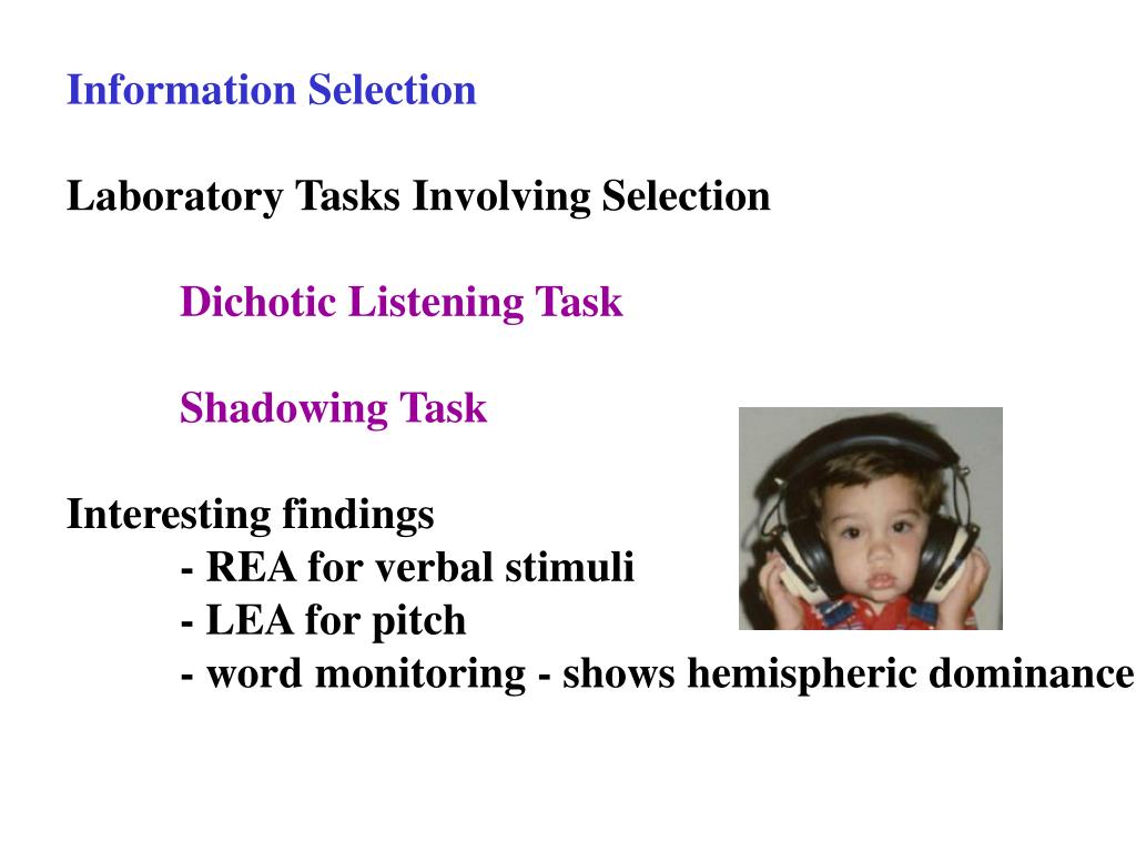 Information Selection Laboratory Tasks Involving Selection Dichotic Listening Task Shadowing Task Interesting findings - REA for verbal stimuli - LEA for pitch - word monitoring - shows hemispheric dominance
