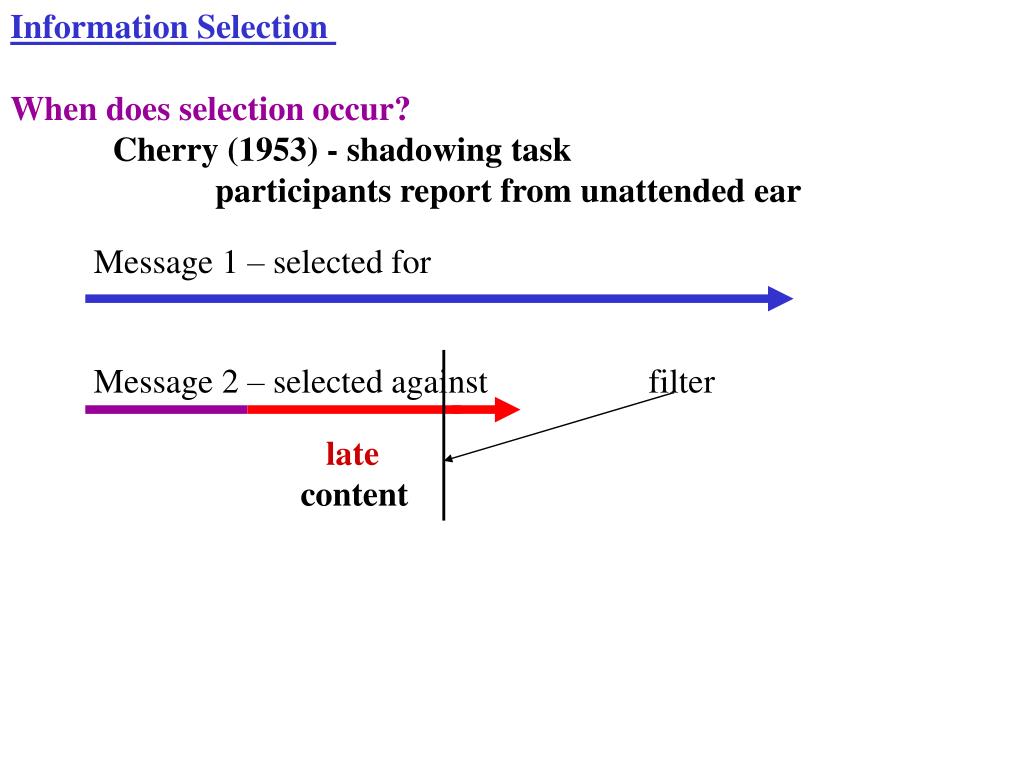 Information Selection When does selection occur? Cherry (1953) - shadowing task participants report from unattended ear Message 1 – selected for Message 2 – selected against filter earlylate physical content characteristics