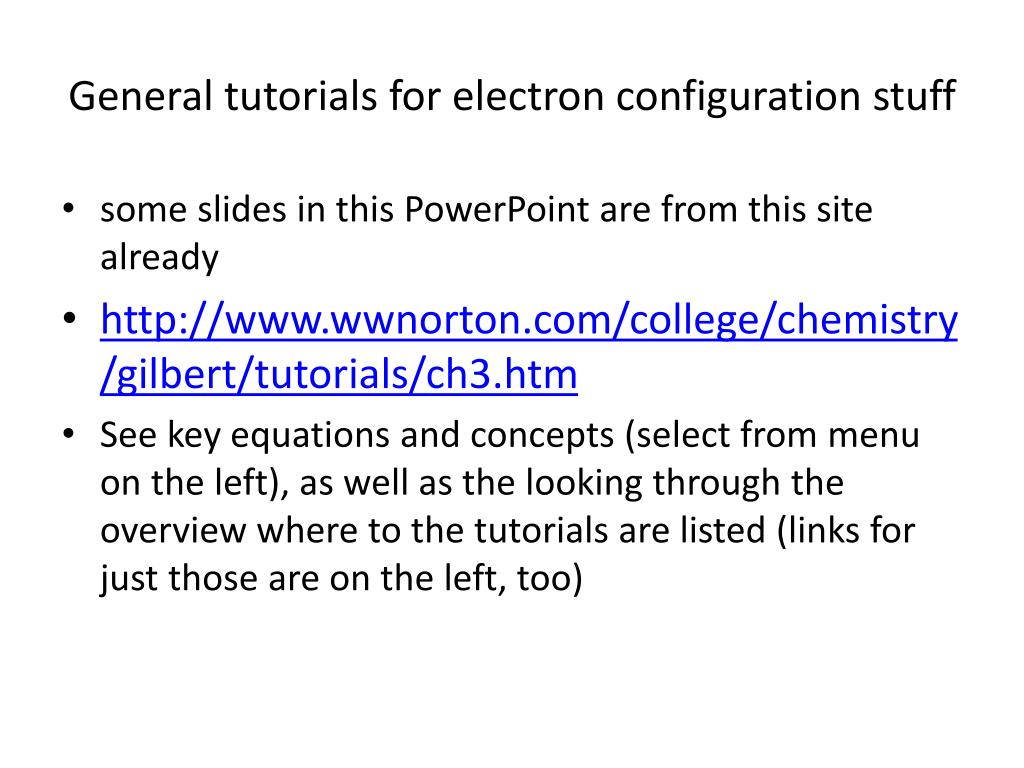 General tutorials for electron configuration stuff • some slides in this PowerPoint are from this site already • http://www.wwnorton.com/college/chemistry/gilbert/tutorials/ch3.htm • See key equations and concepts (select from menu on the left), as well as the looking through the overview where to the tutorials are listed (links for just those are on the left, too)