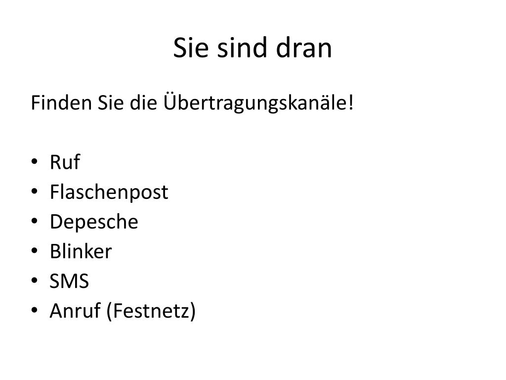 Sie sind dran Finden Sie die Übertragungskanäle! • Ruf • Flaschenpost • Depesche • Blinker • SMS • Anruf (Festnetz)