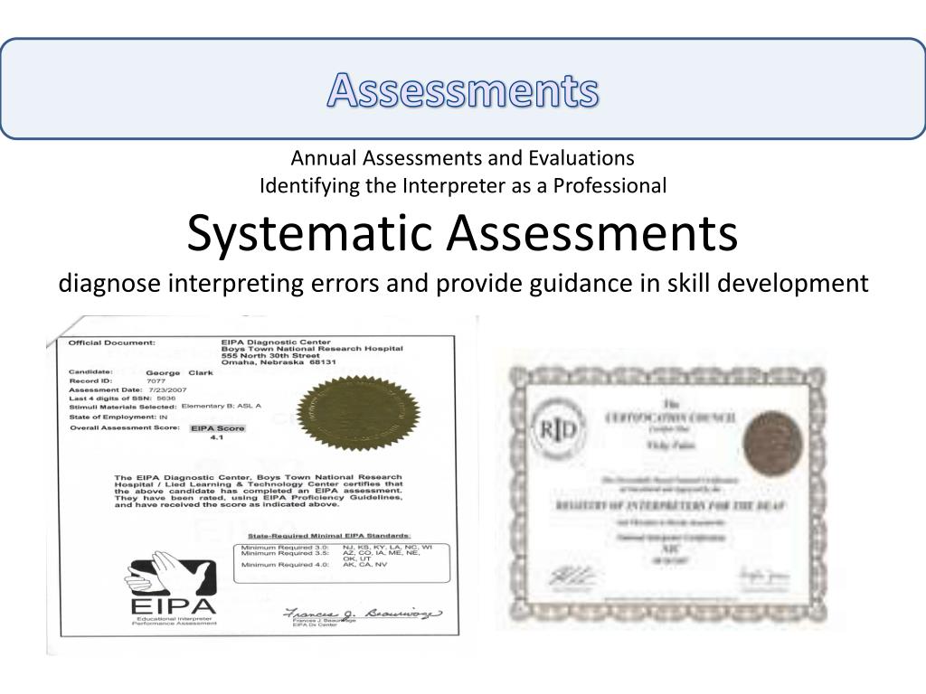 Systematic Assessmentsdiagnose interpreting errors and provide guidance in skill development Assessments Annual Assessments and Evaluations Identifying the Interpreter as a Professional