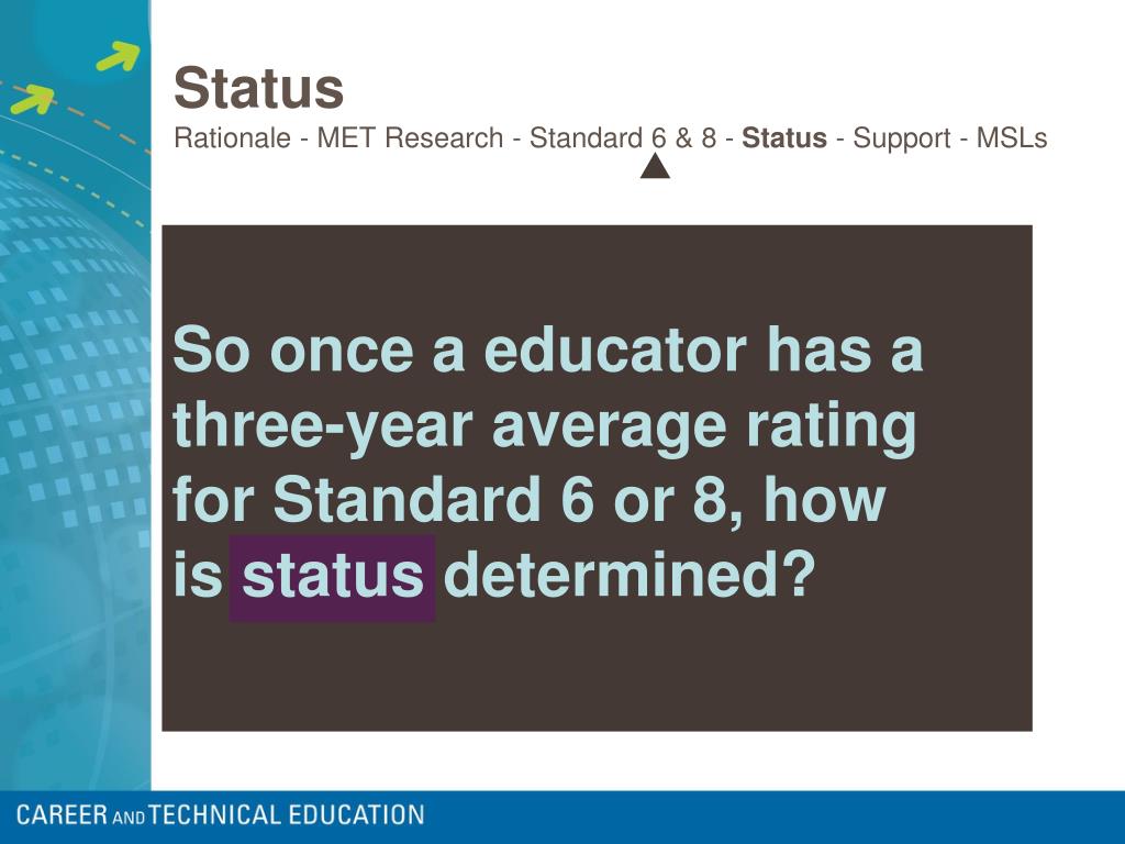 Status and Standard 6 & 8 Rationale - MET Research - Standard 6 & 8 - Status - Support - MSLs ▲ • An educator receives an effectiveness status only once she has 3 years of data on Standard 6 or 8 • A 3-year rolling average of growth data from standard 6 or 8 is used as part of determining overall status