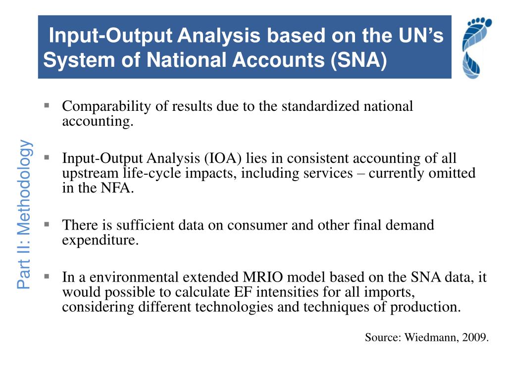Input-Output Analysis based on the UN’s System of National Accounts (SNA) • Comparability of results due to the standardized national accounting. • Input-Output Analysis (IOA) lies in consistent accounting of all upstream life-cycle impacts, including services – currently omitted in the NFA. • There is sufficient data on consumer and other final demand expenditure. • In a environmental extended MRIO model based on the SNA data, it would possible to calculate EF intensities for all imports, considering different technologies and techniques of production. Source: Wiedmann, 2009.