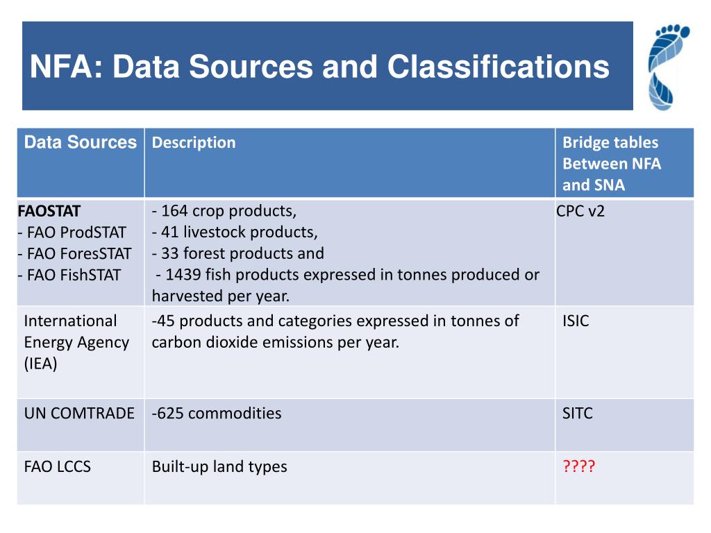 Differences between EF and SEEA Currently used in the National Footprint Accounts (NFA): Life Cycle Assessment (LCA) • Advantage: Detailed import and export flows of goods • 625 commodities measured for embodied import / export of carbon Footprint. • 413 crops measured for embodied import / export of cropland Footprint. • 156 livestock products measured for embodied import / export of grazing land Footprint. • 117 fish products measured for embodied import / export of fishing grounds Footprint. • 33 forest products measured for embodied import / export of forest land Footprint. • Disadvantage: Apparent consumption.