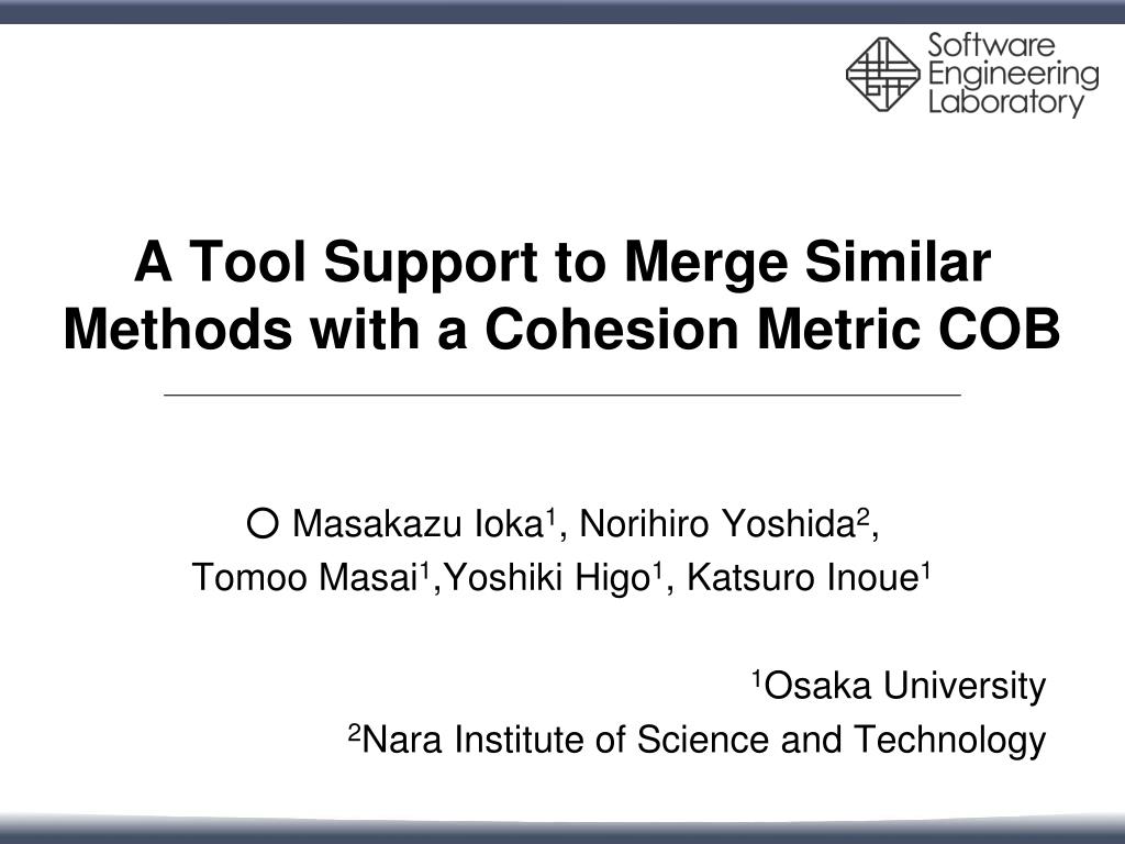 A Tool Support to Merge Similar Methods with a Cohesion Metric COB ○ Masakazu Ioka1, NorihiroYoshida2, Tomoo Masai1,Yoshiki Higo1, KatsuroInoue1 1Osaka University 2Nara Institute of Science and Technology