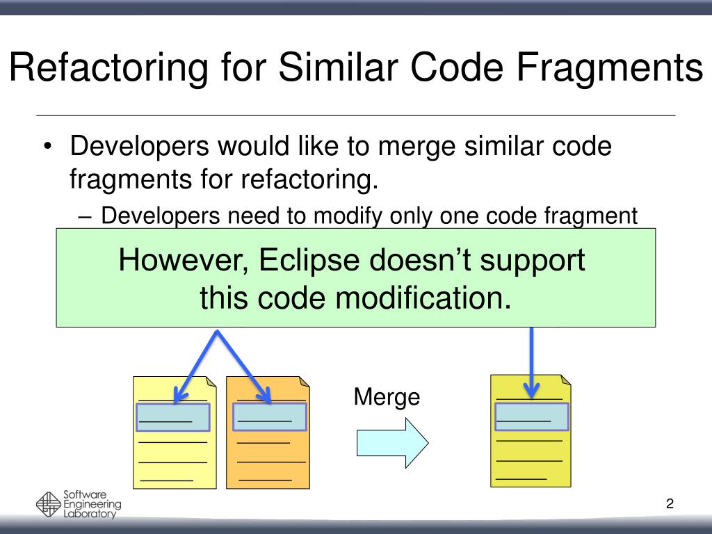 Refactoring for Similar Code Fragments • Developers would like to merge similar code fragments for refactoring. • Developers need to modify only one code fragment after merging However, Eclipse doesn’t support this code modification. Modify Modify Merge