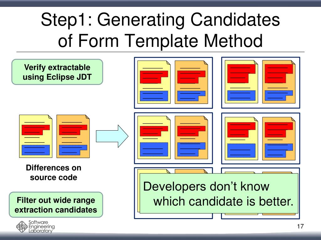 Step1: Generating Candidatesof Form Template Method Verify extractable using Eclipse JDT Differences on source code Developers don’t know which candidate is better. Filter out wide range extraction candidates