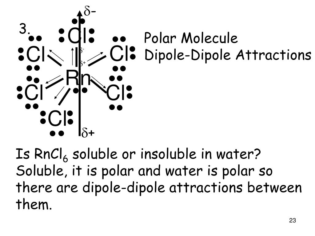 d- 3. Cl Cl Cl d- d+ Rn Cl Cl Cl d+ Polar Molecule Dipole-Dipole Attractions Is RnCl6 soluble or insoluble in water? Soluble, it is polar and water is polar so there are dipole-dipole attractions between them.