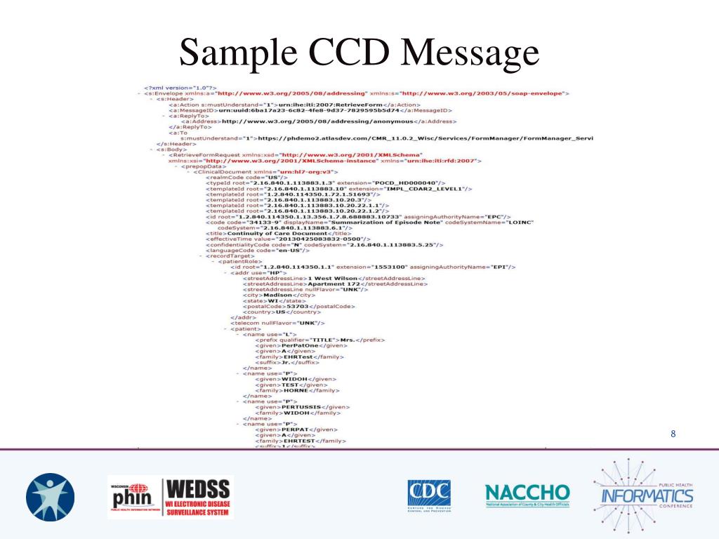 Data Parsed from the CCD Message The WEDSS application is capable of parsing the following common core data set from a CCD message. First Name Middle Name Last Name DOB Gender Home Phone Street Address Apartment Number City State Zip Country Ethnicity Race Pregnant (if female) Expected Delivery Date Reporting Source Medical Record Number (if pregnant) Diagnosed Disease LOINC SNOMED Organizational ID NPI 9