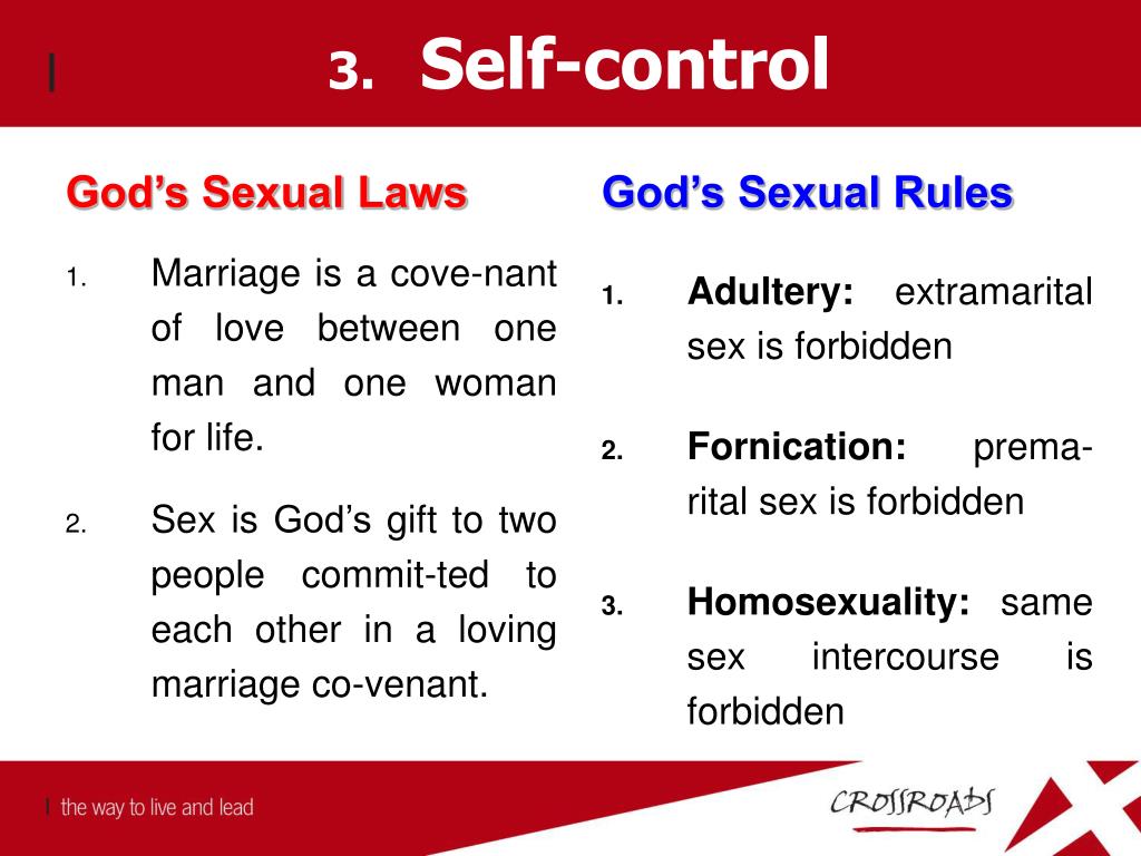 11. God’s Sexual Laws Marriage is a cove-nant of love between one man and one woman for life. Sex is God’s gift to two people commit-ted to each other in a loving marriage co-venant. God’s Sexual Rules Adultery: extramarital sex is forbidden Fornication: prema-rital sex is forbidden Homosexuality: same sex intercourse is forbidden 3. Self-control