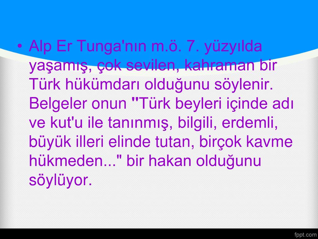 ALP ER TUNGA. Alp Er Tunga'nın m.ö. 7. yüzyılda yaşamış, çok sevilen, kahraman bir Türk hükümdarı olduğunu söylenir. Belgeler onun " Türk beyleri içinde adı ve kut'u ile tanınmış, bilgili, erdemli, büyük illeri elinde tutan, birçok kavme hükmeden..." bir hakan olduğunu söylüyor.