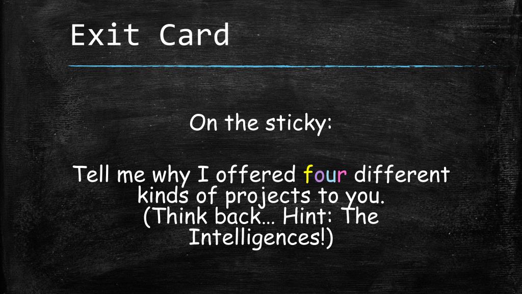 Exit Card On the sticky: Tell me why I offered four different kinds of projects to you. (Think back… Hint: The Intelligences!)
