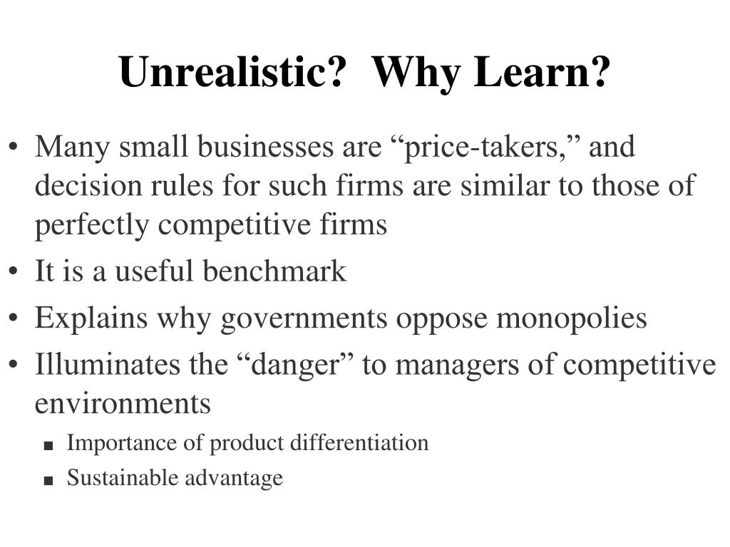 Unrealistic? Why Learn? • Many small businesses are “price-takers,” and decision rules for such firms are similar to those of perfectly competitive firms • It is a useful benchmark • Explains why governments oppose monopolies • Illuminates the “danger” to managers of competitive environments • Importance of product differentiation • Sustainable advantage