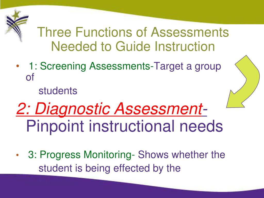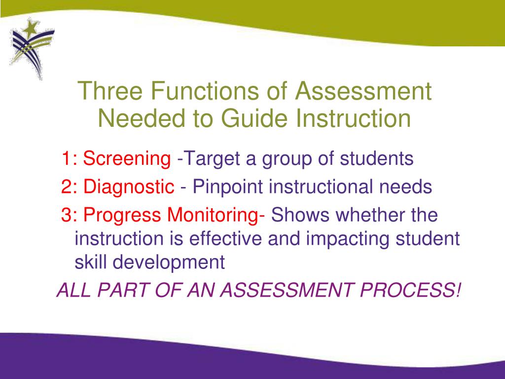 Three Functions of Assessment Needed to Guide Instruction 1: Screening -Target a group of students 2: Diagnostic - Pinpoint instructional needs 3: Progress Monitoring- Shows whether the instruction is effective and impacting student skill development ALL PART OF AN ASSESSMENT PROCESS!