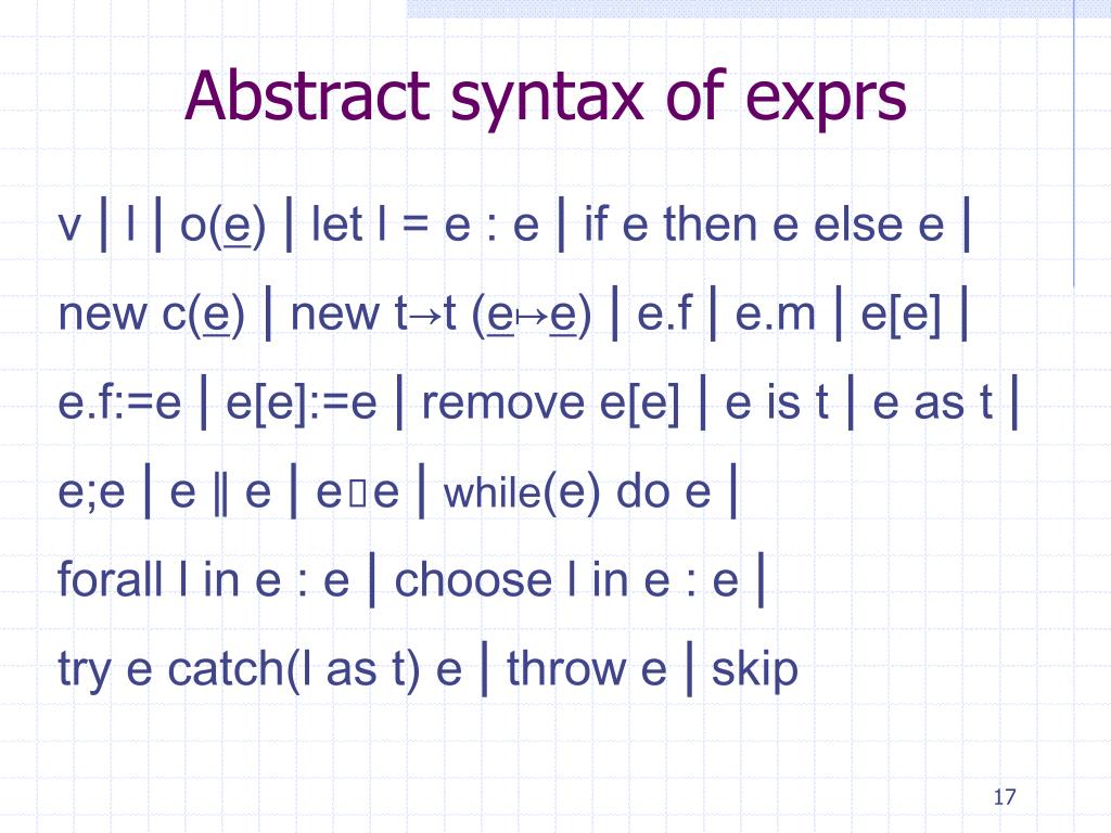 Abstract syntax of exprs v | l | o(e) | let l = e : e | if e then e else e | new c(e) | new t→t (e↦e) | e.f | e.m | e[e] | e.f:=e | e[e]:=e | remove e[e] | e is t | e as t | e;e | e ∥ e | e⌷e |while(e) do e | forall l in e : e | choose l in e : e | try e catch(l as t) e | throw e | skip