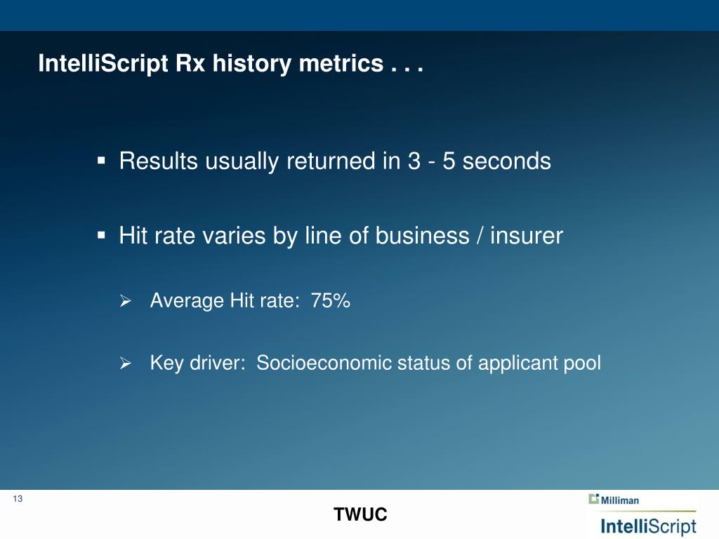 Rx histories have become a standard screening tool. TWUC “At present nearly 80 percent of life carriers deploy pharmacy records in life underwriting….Virtually all others are at some stage of vetting this asset”. - Hank George, FALU, CLU, FML Making Progress in Life Underwriting. Resource. Feb 2012 ;12