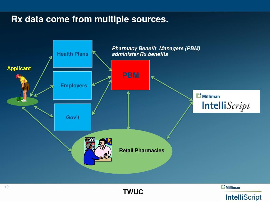 Rx data come from multiple sources. Health Plans Pharmacy Benefit Managers (PBM) administer Rx benefits PBM Applicant Employers Gov’t Retail Pharmacies TWUC