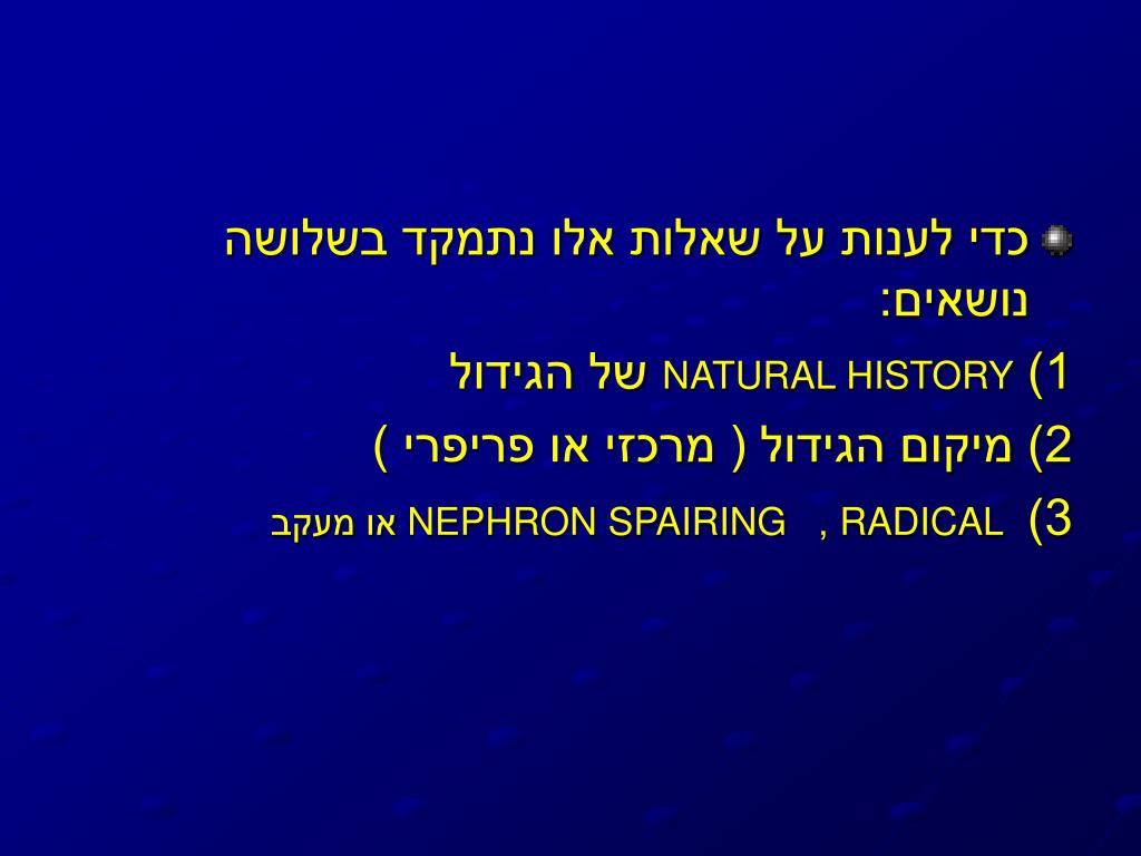 כדי לענות על שאלות אלו נתמקד בשלושה נושאים: 1) NATURAL HISTORY של הגידול 2) מיקום הגידול ( מרכזי או פריפרי ) 3) RADICAL , NEPHRON SPAIRING או מעקב