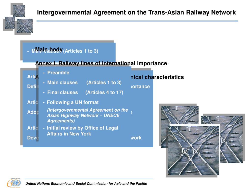 - Main clauses (Articles 1 to 3) - Final clauses (Articles 4 to 17) - Main clauses (Articles 1 to 3) Article 1 - Preamble Definition of railway lines of international importance - Initial review by Office of Legal Affairs in New York Article 2 Adoption of the Trans-Asian Railway Network - Following a UN format (Intergovernmental Agreement on the Asian Highway Network – UNECE Agreements) Article 3 Development of the Trans-Asian Railway Network United Nations Economic and Social Commission for Asia and the Pacific Intergovernmental Agreement on the Trans-Asian Railway Network Main body Annex I. Railway lines of international Importance Annex II. Guiding principles on technical characteristics
