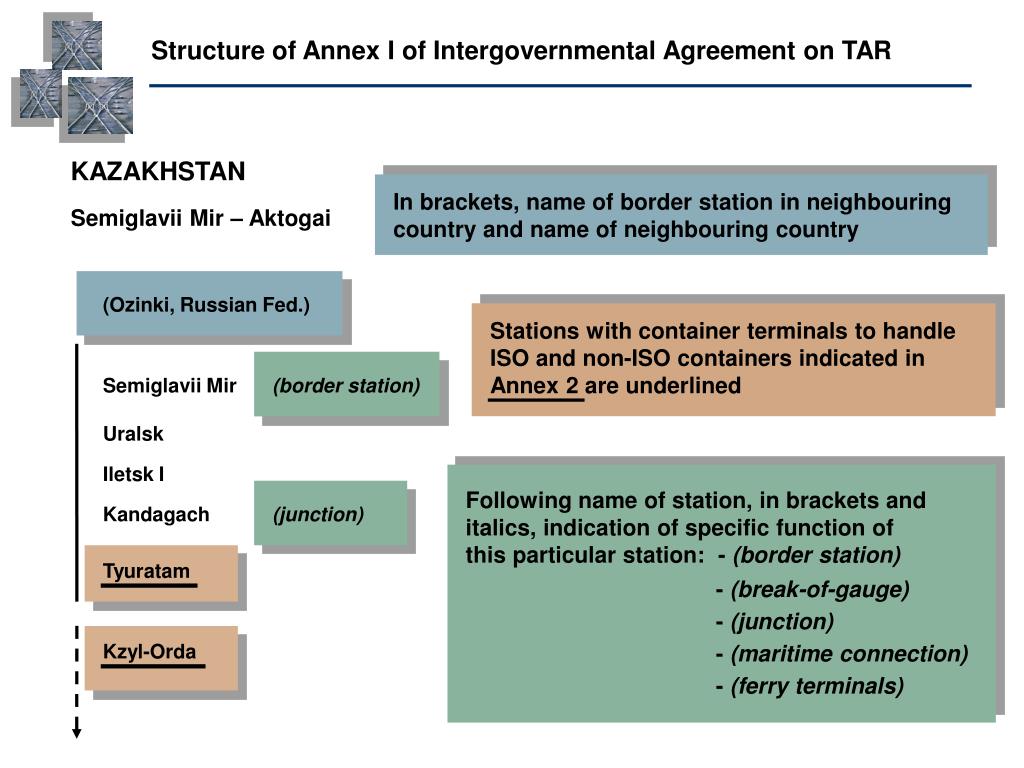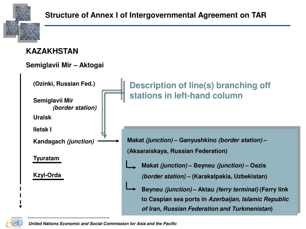 Structure of Annex I of Intergovernmental Agreement on TAR COUNTRY NAME(Bold - Capital) Description of line Description of other line(s) branching off the line indicated in left-hand column Name of line being described (Bold) Tyuratam Kzyl-Orda United Nations Economic and Social Commission for Asia and the Pacific KAZAKHSTAN KAZAKHSTAN Semiglavii Mir – Aktogai Semiglavii Mir – Aktogai (Ozinki, Russian Fed.) Semiglavii Mir (border station) Uralsk Iletsk I Makat (junction) – Ganyushkino (border station) – (Aksaraiskaya, Russian Federation) Kandagach (junction) Makat (junction) – Beyneu (junction) – Oazis (border station) – (Karakalpakia, Uzbekistan) Beyneu (junction) – Aktau(ferry terminal) (Ferry link to Caspian sea ports in Azerbaijan, Islamic Republic of Iran, Russian Federation and Turkmenistan)
